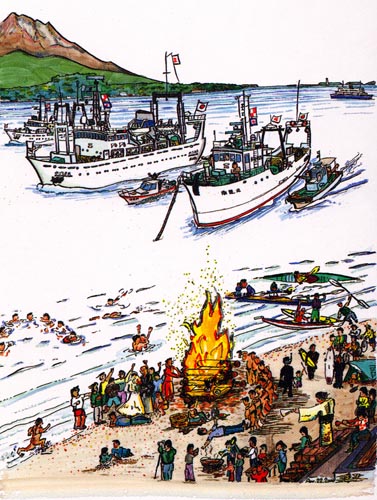 藤枝がこれまで描いてきました鹿児島大学水産学部に関わる絵を紹介します。 これらの絵のほとんどは,Tシャツ,絵葉書,カレンダー,水産学部広報物,各種印刷物表紙および挿し絵などに利用されてきたものです。 これらを利用されたい方,また新たな作品の製作を希望される方は,藤枝までご連絡ください。