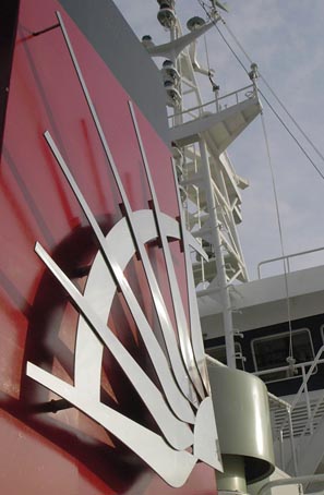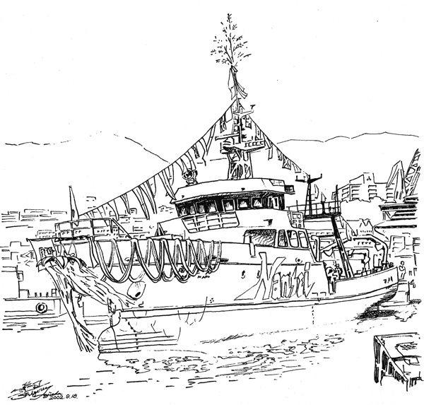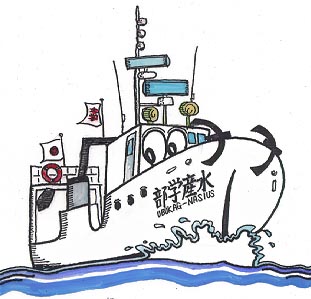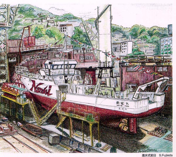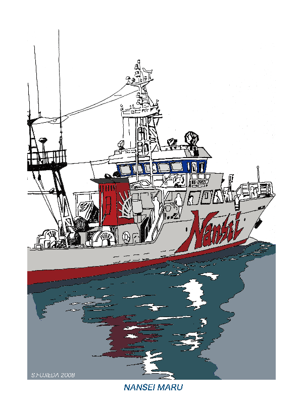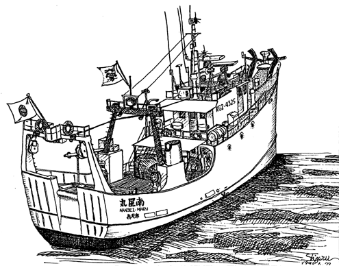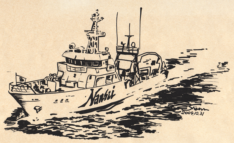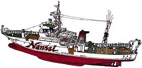2002年12月,新南星丸が就航しました。大きさも2倍以上となり沿岸域での実習も充実するようになりました。 ここでは新旧の南星丸を絵で紹介します。 新南星丸のデザインは,建造前の完成予想図をもとに計画されていきました。ファンネルマークや船側の「NansEi」の文字は藤枝の作品です。※南星丸のファンネルマーク:南に輝く太陽をモチーフにしたもので,6本の光線は水産学部の五つの大講座とセンター,それらを貫く一つの光輪は南星丸の航跡をイメージしています。このマークはステンレス製であり,光線部分が傾斜しているため,太陽光線との角度によって一枚ずつ光るようになっています。